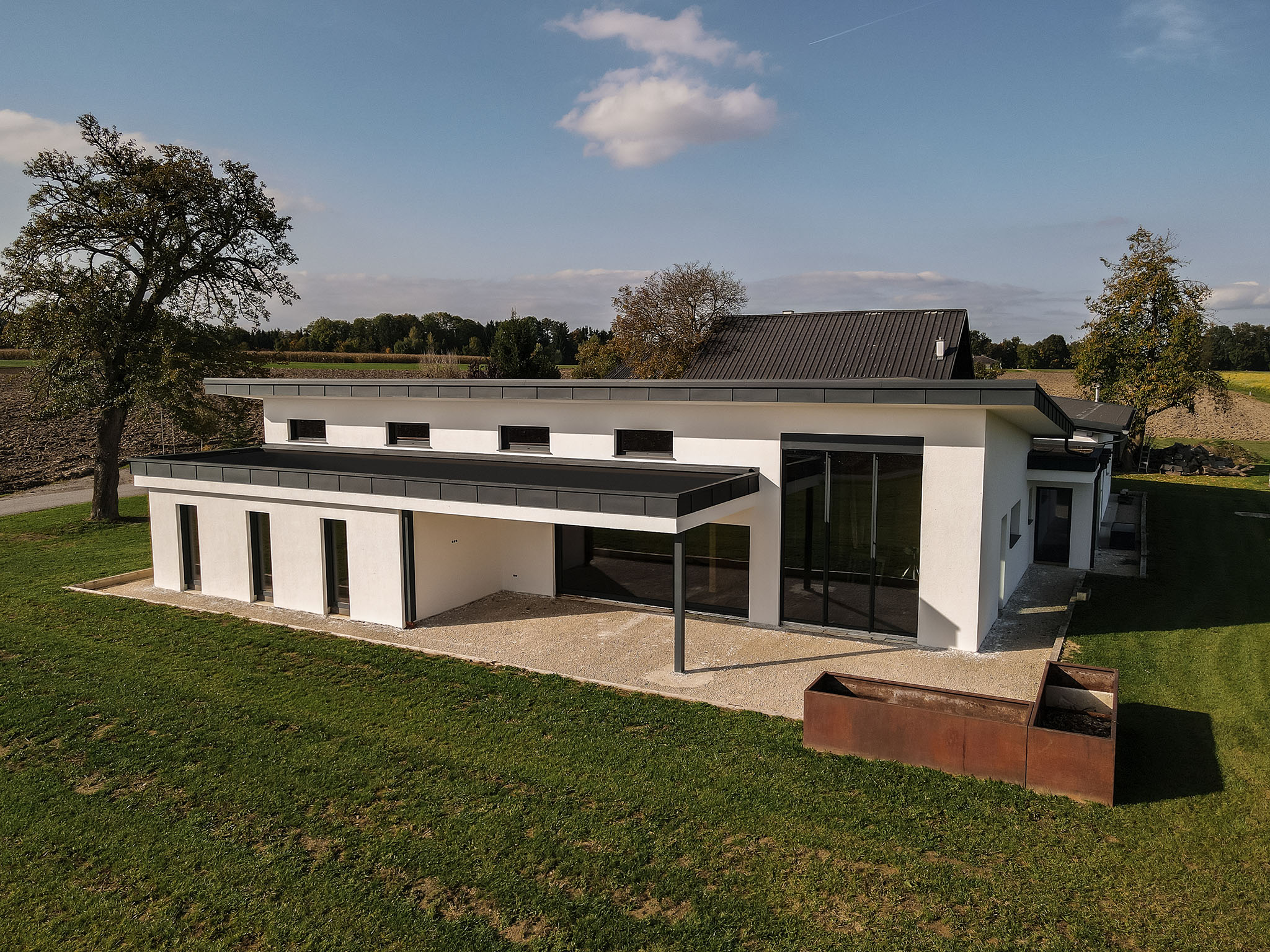 Als vorgefertigte Module werden die teilmontierten Elemente auf den LKW verladen und zum Montagetermin am Bauplatz zusammengefügt. Wenn das Dach geschlossen ist und die Fenster gesetzt sind, können die finalen Anschlussarbeiten an den Außenflächen vollzogen werden.